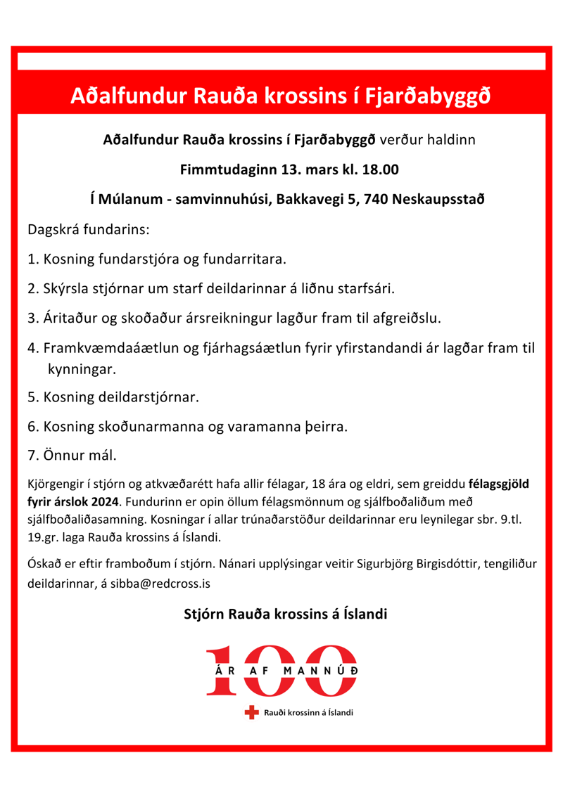 Aðalfundur Rauða krossins í Fjarðabyggð verður haldinn fimmtudaginn 13. mars kl. 18:00 í Múlanum - samvinnuhúsi, Bakkavegi 5, 740 Neskaupsstað