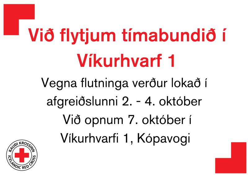 The main office of the Icelandic Red Cross is moving temporarily from Efstaleiti 9 to Víkurhvarf 1 due to maintenance. Due to the move, the office will be closed between the 2nd and 4th of October.