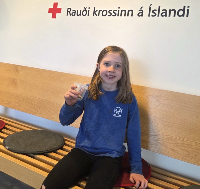 Margrét Kría, sex ára (alveg að verða sjö), mætti galvösk í höfuðstöðvar Rauða krossins nýverið til að gefa félaginu peninga sem hún hafði safnað.