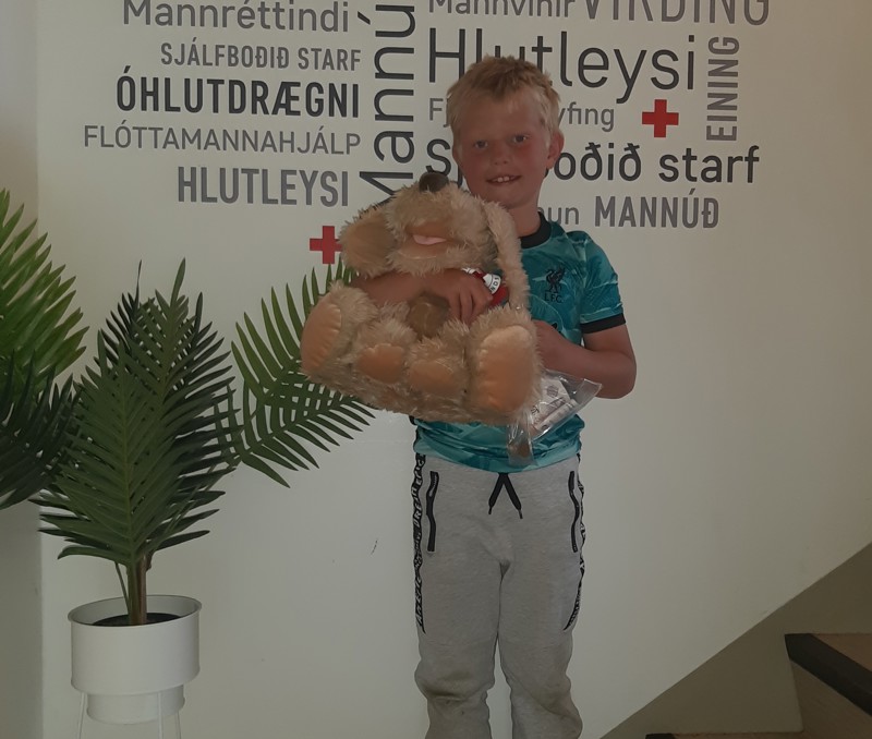 Þessi ungi maður, Viktor Máni Jónsson safnaði peningum við Nettó á Akureyri til styrktar Úkraínu og afhent Rauða krossinum við Eyjafjörð afraksturinn, 8.500 krónur.