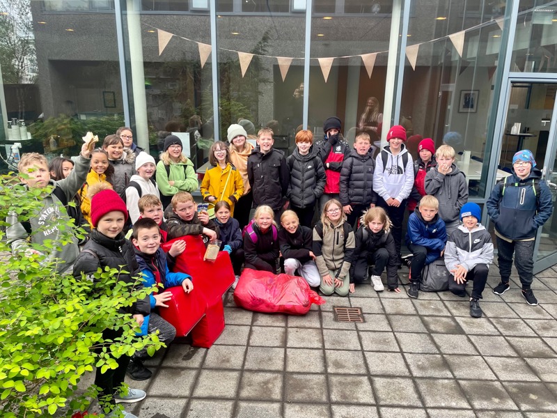 Fimmti bekkur í Helgafellsskóla kom færandi hendi í afgreiðslu Rauða krossins í Efstaleiti 9.
