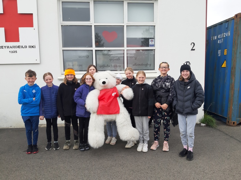 Þetta unga fólk hélt tombólu á Akureyri til styrktar Úkraínu og afhentu Rauða krossinum við Eyjafjörð afraksturinn 64.063 krónur.