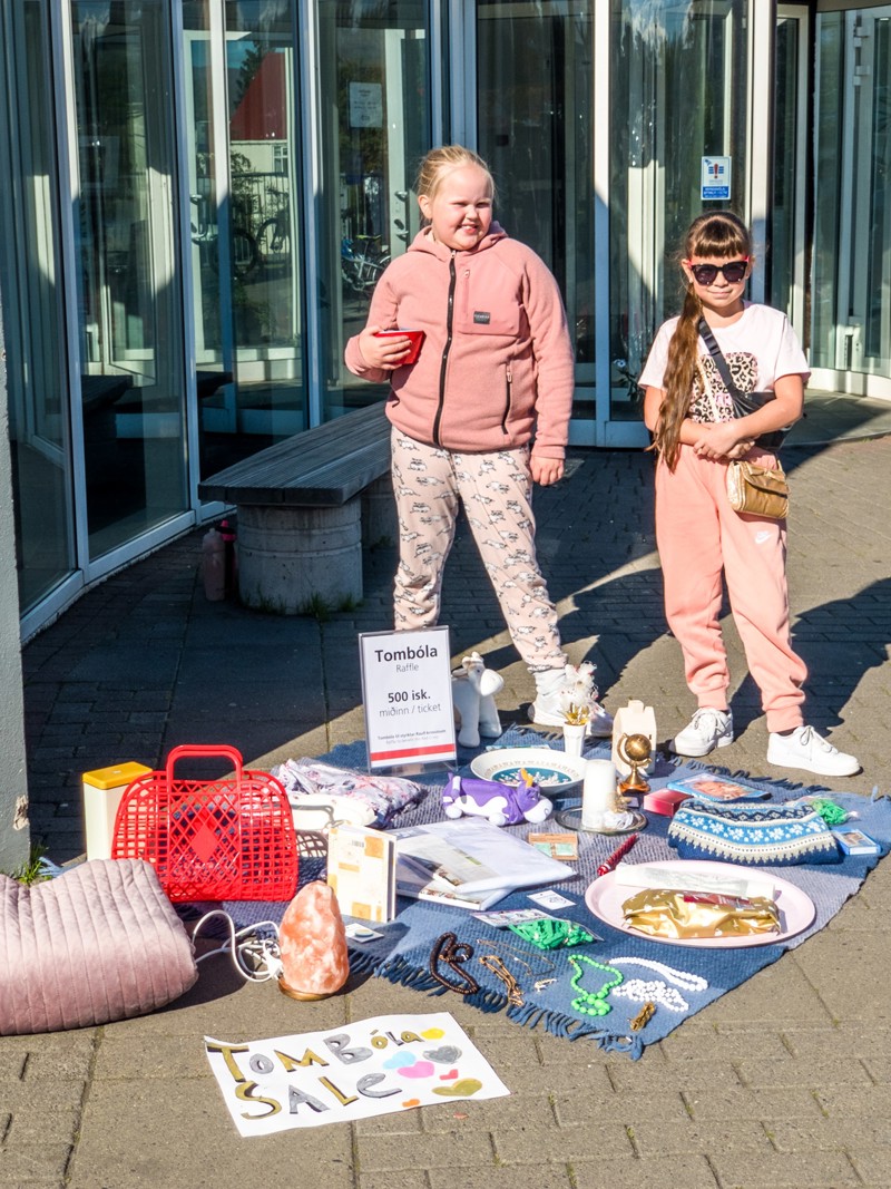 Þessar ungu stúlkur héldu tombólu við Sundlaugina á Akureyri til styrktar Rauða krossinum.