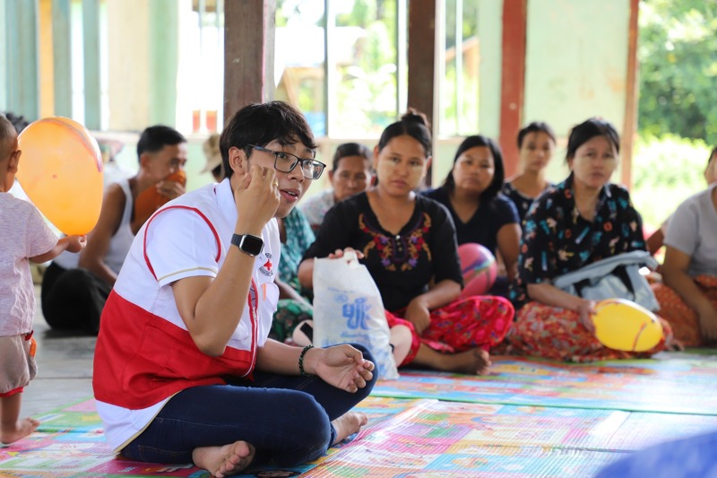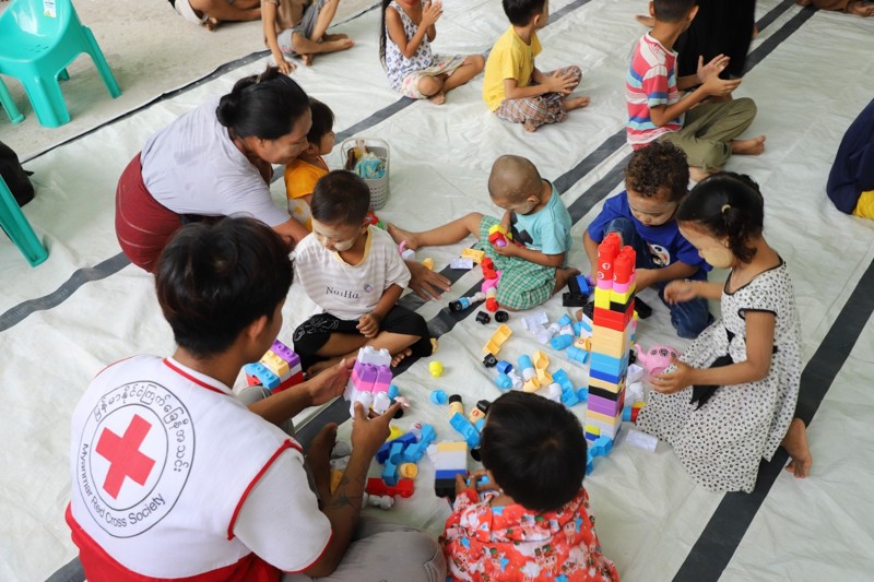 Fyrstu viðbrögð mjanmarska Rauða krossins fólust m.a. í tafarlausri neyðaraðstoð. Fyrsta hjálp, bæði líkamleg og sálræn, var veitt. Sett voru upp neyðarskýli og hjálpargögnum dreift. Þá var komið fyrir færanlegum heilsugæslustöðvum, tímabundnar vatnsveitur settar upp sem og salernisaðstaða.