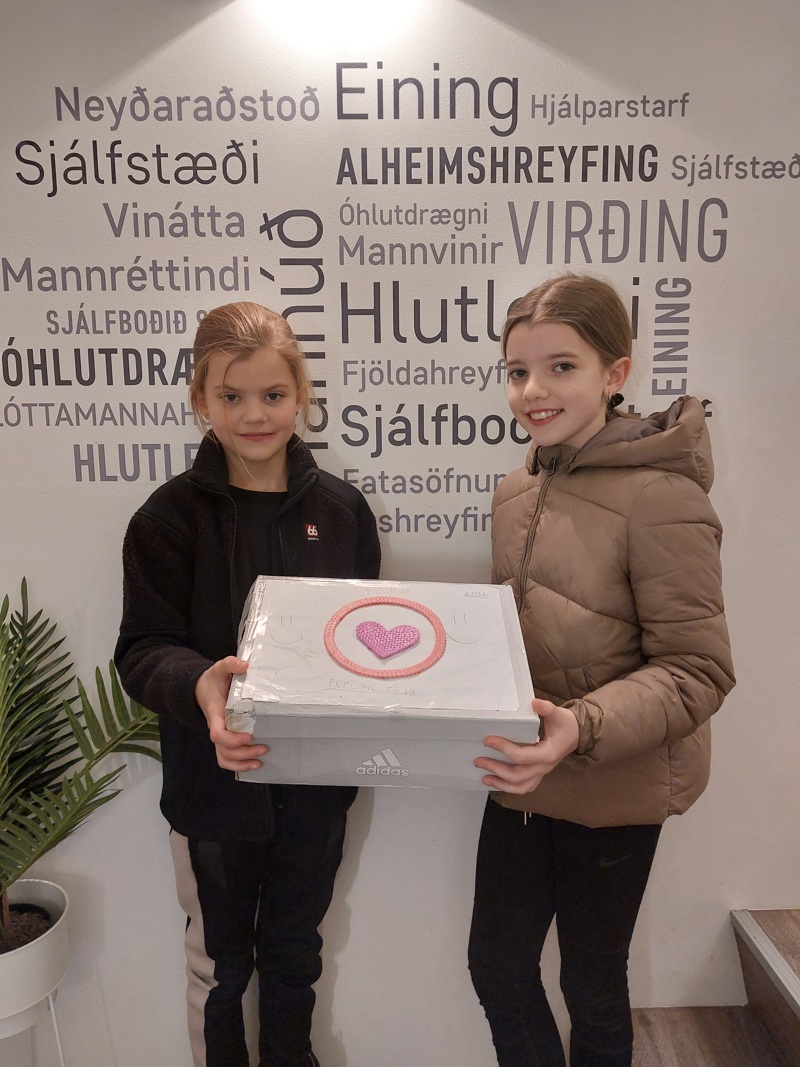 Það voru því stoltar frænkur sem komu og afhentu Rauða krossinum afraksturinn og ekki skemmir gleðin við að sjá skrautið hangandi í gluggum á heimilum og bílum nágranna sinna.