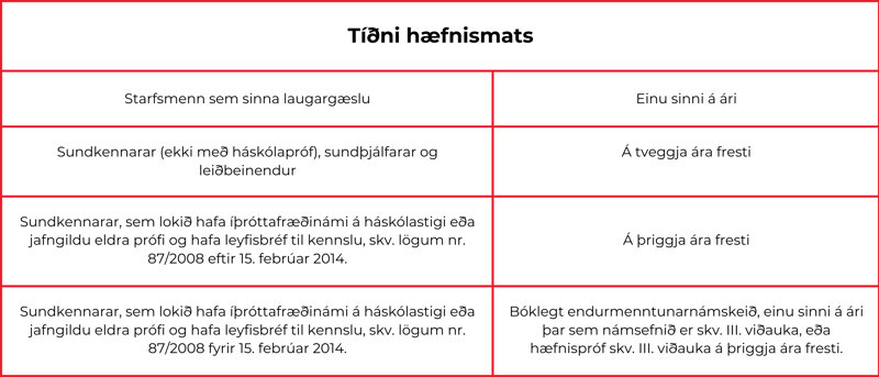 Starfsmenn sem sinna laugargæslu skulu árlega standast hæfnismat skv. III. viðauka reglugerðar nr. 814/2010 um hollustuhætti á sund- og baðstöðum. Sundkennarar, sundþjálfarar og leiðbeinendur skulu standast hæfnismat skv. III. viðauka fyrrnefndrar reglugerðar á tveggja ára fresti. Sundkennurum, sem lokið hafa íþróttafræðinámi á háskólastigi eða jafngildu eldra prófi og hafa leyfisbréf til kennslu, skv. lögum nr. 87/2008, um menntun, ráðningu kennara og skólastjórnenda við leikskóla, grunnskóla og framhaldsskóla, standast hæfnismat skv. III. viðauka á þriggja ára fresti.
