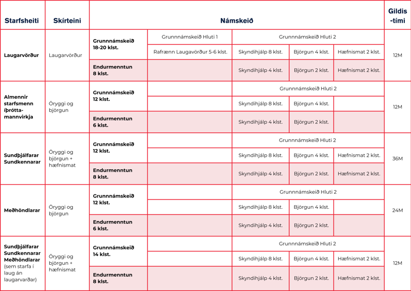Fari starfsmaður í fæðingarorlof eða veikindaleyfi þarf viðkomandi ekki að sitja grunnnámskeið, en þarf að sitja endurmenntunar námskeið.